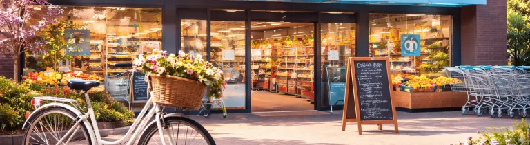 Realistische foto van een moderne supermarkt in Sittard met verse producten en een heldere, uitnodigende sfeer.